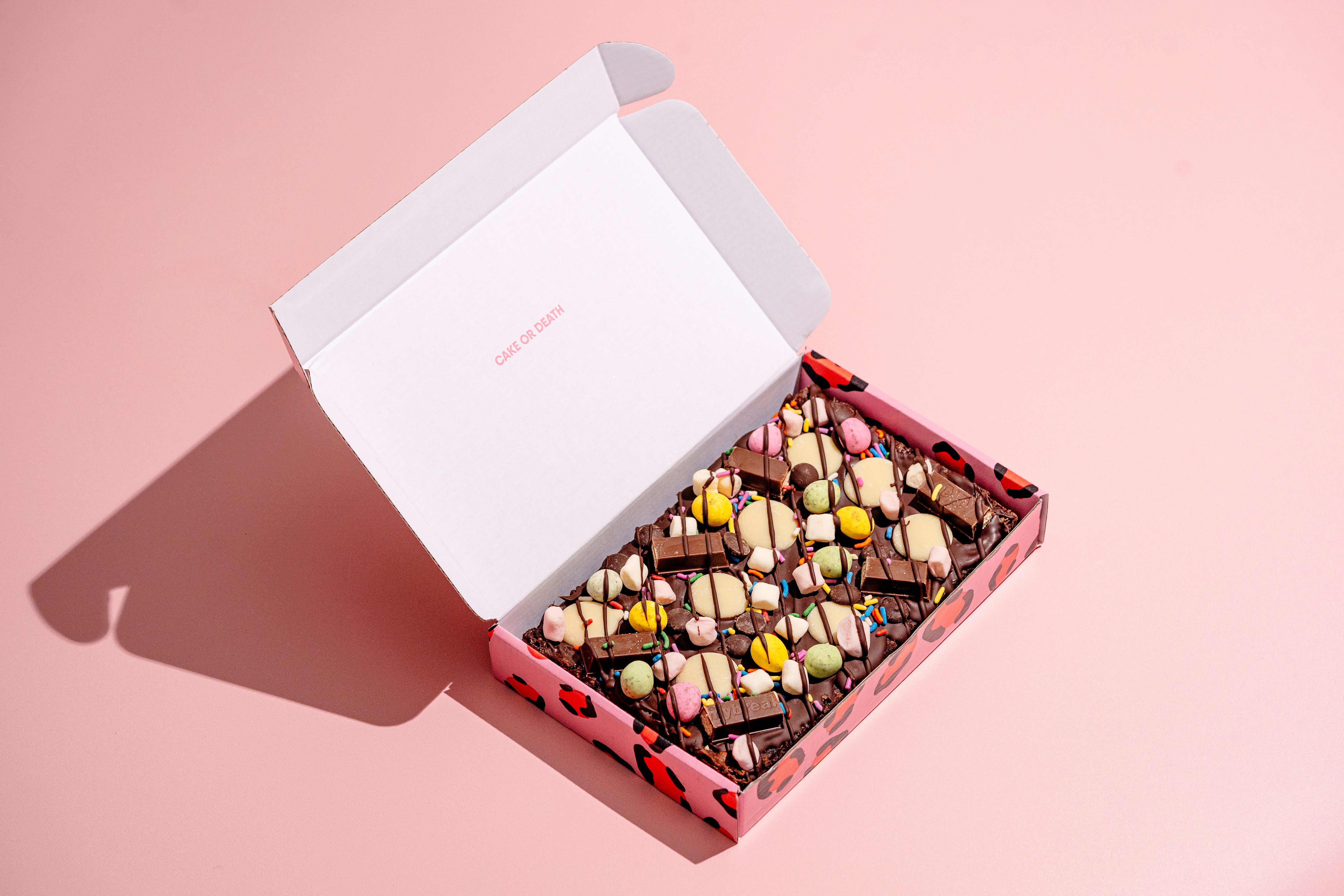 Cake or Death’s classic fudgy brownie is topped with a tempting truckload of treats: Mummy Meegz mini eggs Eggs, Dark Chocolate Chips, Freedom Marshmallows, Sprinkles and Dark Chocolate Drizzle.